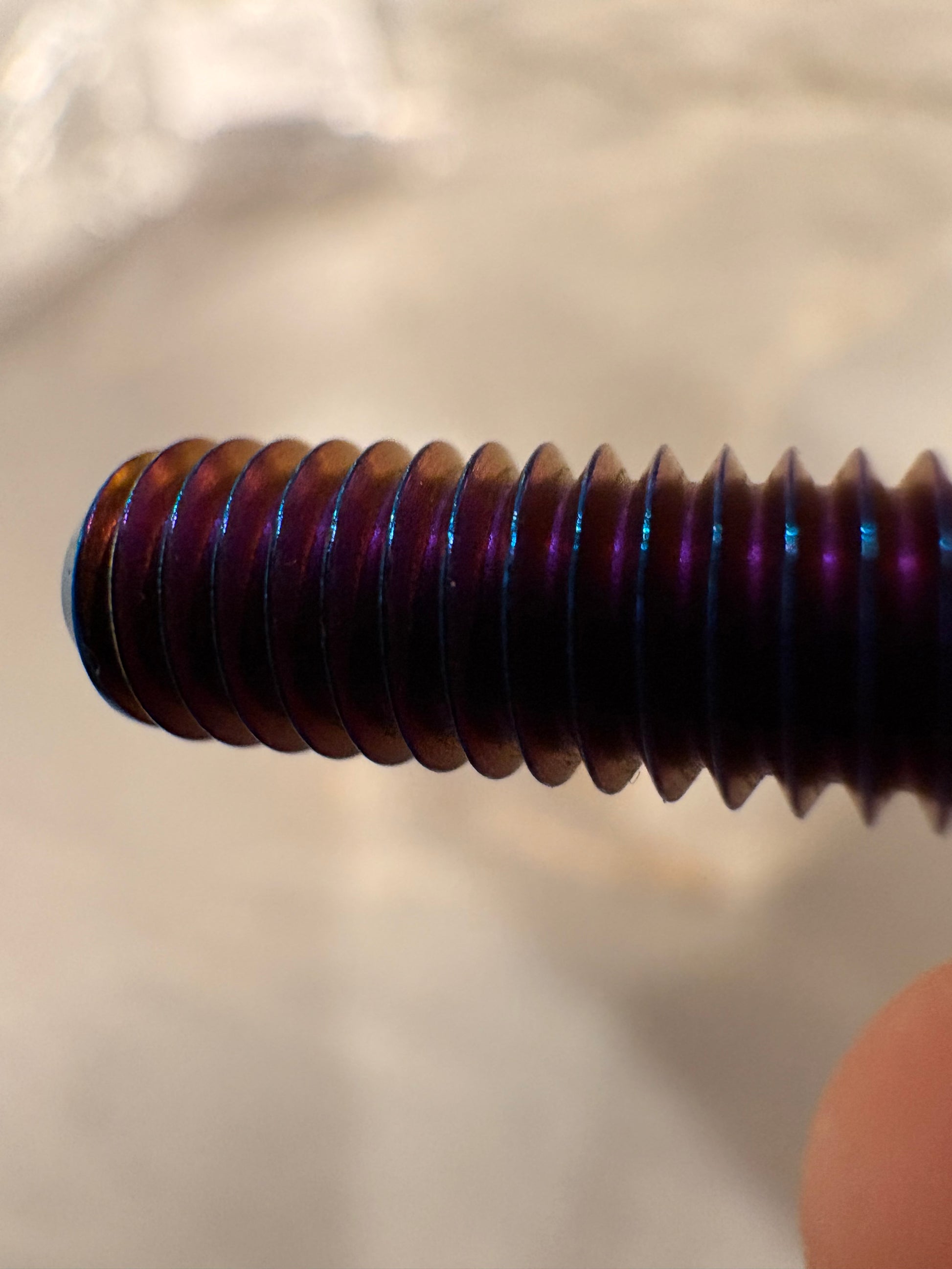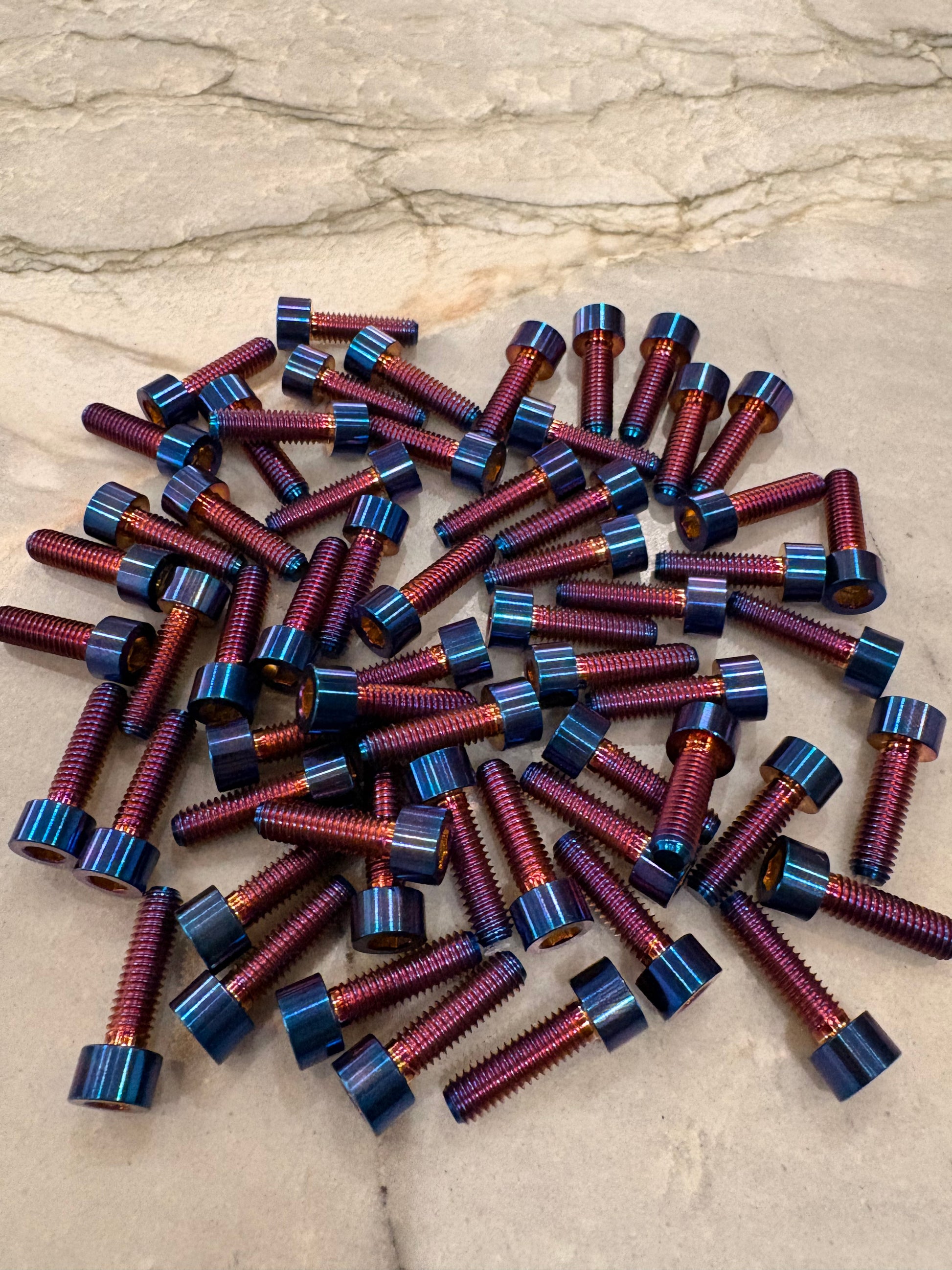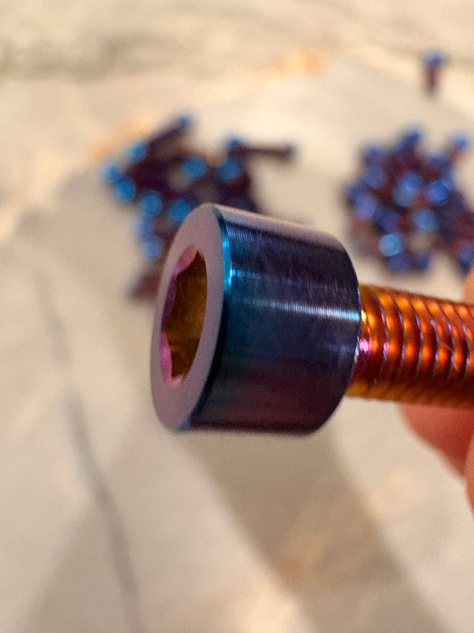 titanium bolts for brake caliper of Surron LBX, may work for other emotos. Genuine grade 5 Burnt blue color titanium.